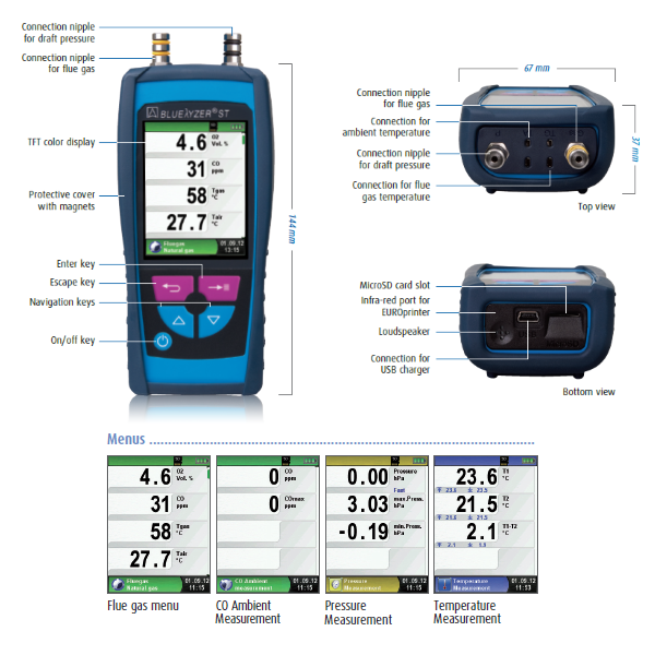 The appliance only has 5 controls, a clear English menu structure and a large TFT colour display. The built-in rechargeable battery makes using normal batteries superfluous. You can read the measurements from the display, store it on an optional MicroSD card or print it with the optional EUROprinter.